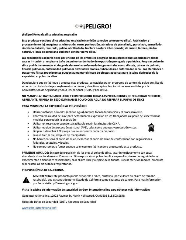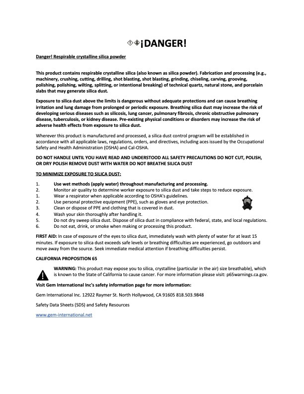 The products identified above contain respirable crystalline silica (also known as silica dust). Fabrication and processing (i.e., machining, crushing, cutting, drilling, abrading, abrasive blasting, grinding, chiseling, carving, gouging, polishing, buffing, fracturing, or intentional breaking) of engineered quartz, natural stone and porcelain slabs can generate silica dust.